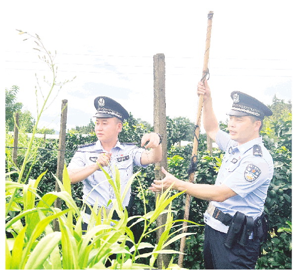 ▲巡逻民警在一处偏僻的果园外围清理非法设置的捕鸟网。
