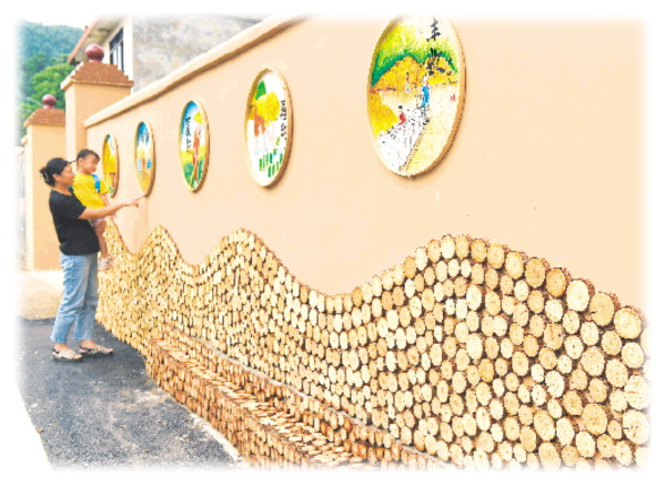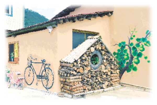 经过精心设计的柴火堆有序摆放在村民的家门口、院墙外,还有一些柴火被锯成块状,贴在墙上做装饰。不仅仅是柴火,村民捐献的老物件、旧轮胎、石磨等“过时”的旧物件,也成了村民建造美丽乡村的“宝物”。