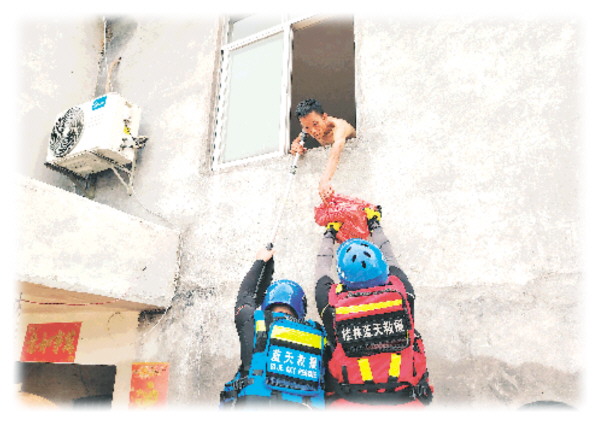 ◤队员给楼上躲避洪水的村民发放救援物资。
