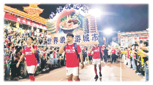 本报贵州榕江讯(记者周文俊 文/摄)9月16日晚,在现场球迷的热浪般的巨大欢呼声中,桂林米粉足球队正式亮相贵州“村超”赛场。桂林米粉、桂林足球、桂林的山歌、桂林的经典歌曲《我想去桂林》、桂林特色美食……一系列桂林元素大放异彩,独特的桂林魅力闪耀“村超”赛场,受到现场全国各地球迷的热烈欢迎,刮起一阵不小的“桂林旋风”。