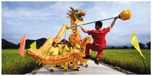 活动在盛大的唱丰收仪式中拉开帷幕,嘉宾代表共同将“金黄麦穗”插入优渥的土壤,祈愿谷粒金黄节节高,大粒丰收大满足。仪式结束,乡亲们表演了瑶族传统舞蹈---金谷稻草龙舞、竹邦舞,唱起了由广西特色经典民歌改编的谷粒大丰收合唱。舞草龙、唱丰收,村民们用热情的舞蹈和动人的歌声表达丰收的喜悦,祈愿来年风调雨顺、五谷丰登。