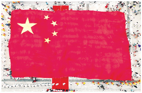 ▲全州县300多名市民齐心协力,共同撑起一面400平方米的巨幅国旗,以此庆祝新中国成立74周年。