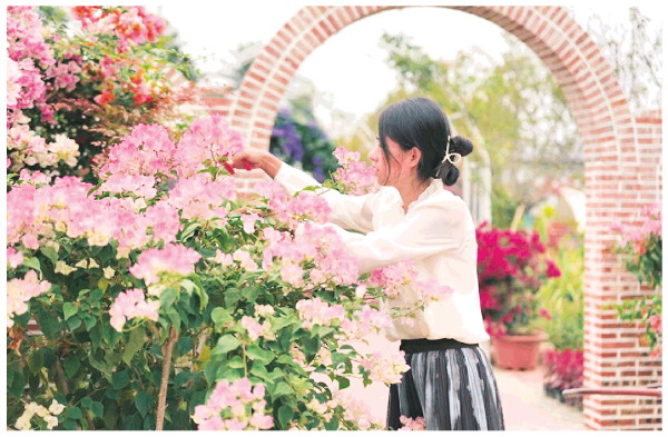 10月12日,在叠彩区缤纷叠彩田园综合体“欣儿的花园”内,园主梁琼方正在精心打理盛放的三角梅,以保证花园呈现最佳状态,迎接五湖四海宾客的到来。