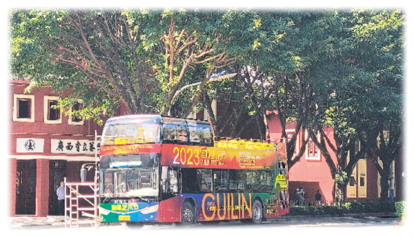 本报讯(记者李思静 文/摄)10月25日,一辆彩色涂装,写有“2023桂林艺术节”字样的敞篷双层巴士驶过中心城区时,不少过路群众拿出手机拍照记录。