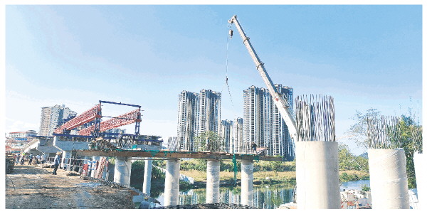 10月23日,恭城瑶族自治县江贝大桥正在紧张有序架设中。江贝大桥是恭城县城滨江东路连接茶江东路段交通项目的一部分,项目总长2.3公里,计划投资1.13亿元,计划于2023年底前建成通车。大桥长167米,建成后,将极大缓解连接县城与贵广高铁恭城站的茶江大桥的交通压力。李振杰 摄