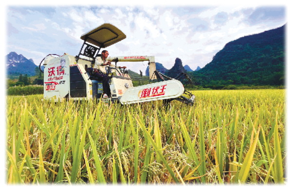 一边坐在树荫底下纳凉,一边欣赏收割机收割黄灿灿的稻谷。随即,牵袋装粮,再扛上车,收割就此告一段落。在阳朔县葡萄镇洞村一些村民中间,之前对高标准农田的质疑声似乎逐渐小了。