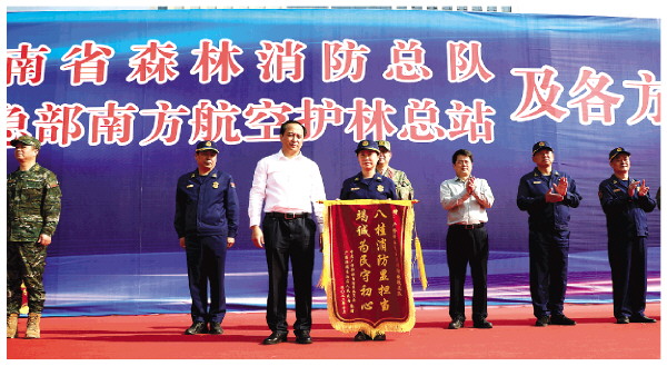▲去年10月,自治区在全州县举行森林火灾参战队伍欢送仪式,桂林市消防救援支队获自治区党委、政府颁赠锦旗。自治区副主席许显辉授旗,桂林市市长李楚参加。