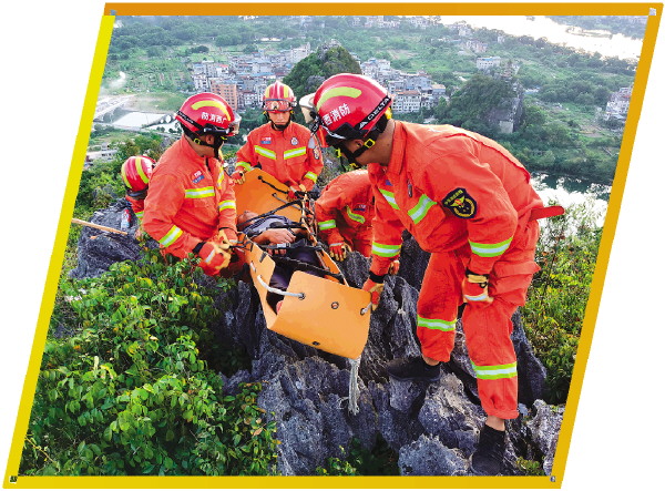 ◥今年8月,桂林市消防救援支队救援人员将一名在山顶摔伤的八旬老人救下山。