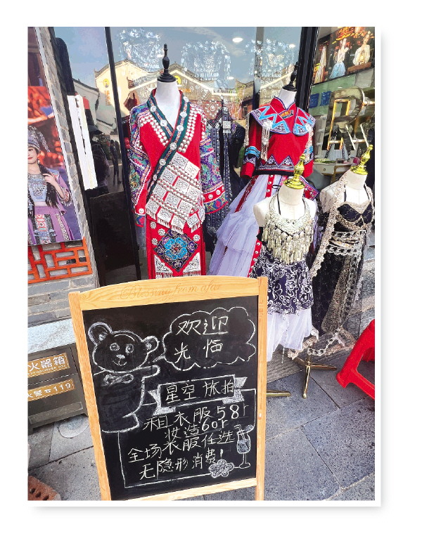 记者走访发现,目前在国内较为大型的旅游城市及景点周边,如桂林、西双版纳、敦煌、凤凰古城、千户苗寨、喀什古城等,都能看到一些当地特色服装租赁店铺,这些店铺可以为游客提供沉浸式体验旅拍,也可以提供民族服饰租赁以及妆造。