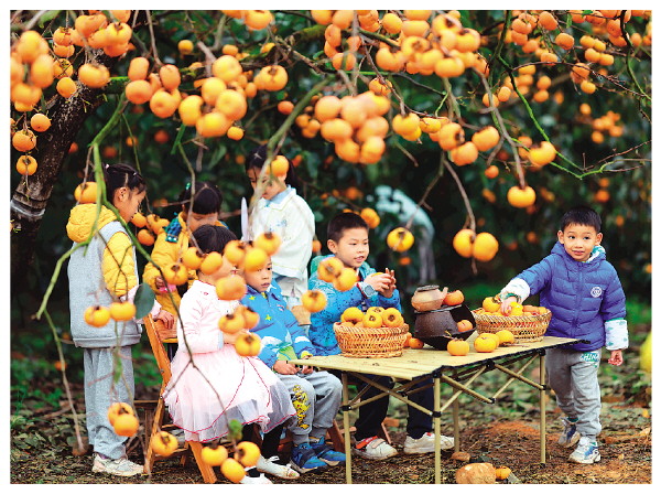 12月3日,在恭城瑶族自治县红岩村,来自广东、湖南、贵州等地的游客正在月柿树下游玩。