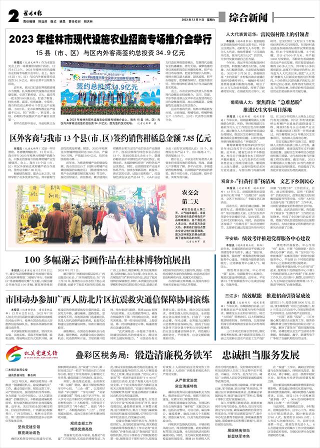 本报讯(记者文新军)又是一年好景致,再赏橙黄橘红时。12月8日,我市举行2023年桂林市柑橘产销推介会,向参会的客商介绍桂林柑橘产业发展情况。会上,我市13个县(市、区)和区外客商达成柑橘产销合作意向,签约总金额7.85亿元。