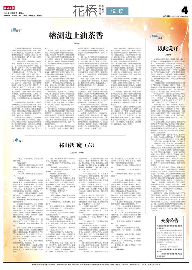不知不觉中,餐馆已到打烊时。但看着我们谈兴正浓,服务员也不好意思给我们下逐客令,又给我们添了半锅油茶,然后转身轻轻掩门出去了。屋内,油茶飘香,浓淡相宜;欢声笑语,其乐融融。屋外,榕湖风来,秋露微凉;桂花吐蕊,满城芬芳。