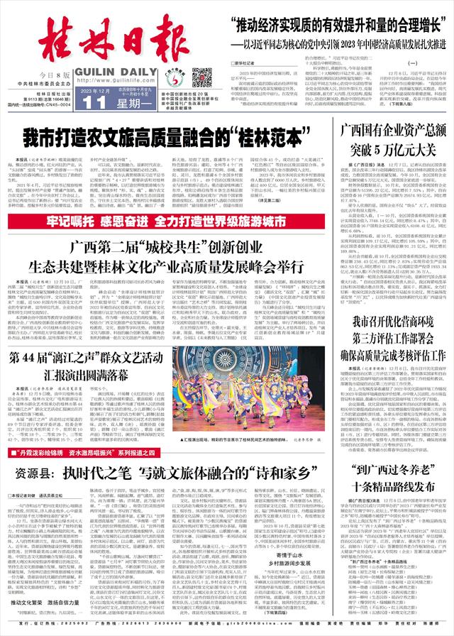 本报讯(记者李思静 通讯员夏菲蔓 唐高君)12月9日晚,由中共桂林市委员会宣传部、桂林市文化广电和旅游局主办,桂林市群众艺术馆承办的桂林市第44届“漓江之声”群众文艺活动汇报演出在百花剧场成功落下帷幕。