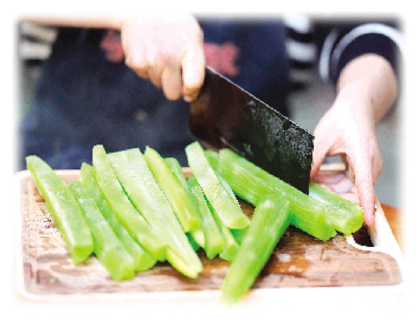 几根长度均有一尺多的莴笋,正是李文平当日选中的制酸“主角”。先用刀把莴笋削皮,备用。接着,就是把莴笋切段。只见李文平把整根莴笋先切成均匀的、约莫有成人手掌长度的长段,接着又把每段莴笋从中间剖开,切成四长条。李文平说,莴笋切成长条还是切成丝,可以根据自家人的喜爱来决定。而喜欢大口吃酸的她,更喜欢切成长条。