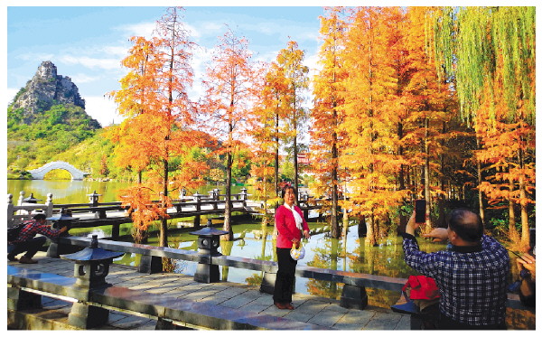 临桂区山水公园的水杉树叶一片金黄,吸引了人们赏景留影。 李腾钊 摄