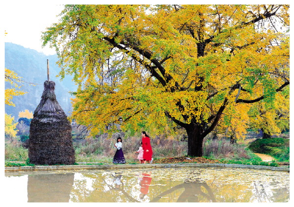 灵川县海洋乡画眉弄村,游客在银杏树下游玩。 记者李忠波 摄