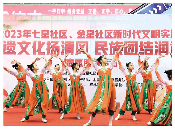 12月16日上午,七星区七星社区、金星社区新时代文明实践站联合举办的“非遗文化扬清风,民族团结润童心”主题活动拉开序幕。传统古典舞表演、清廉主题的非遗剪纸秀、慰问帮扶家庭及少数民族儿童代表……丰富多彩的活动,拉近了邻里之间的距离,增进了友谊与了解,更在社区内营造了“崇廉、奉廉、知廉、学廉”的浓厚氛围,让党员群众在活动中感受到廉洁文化带来的“清风”以及和和美美的大家庭气氛。 记者韦莎妮娜/摄 通讯员王军/文