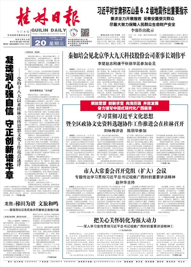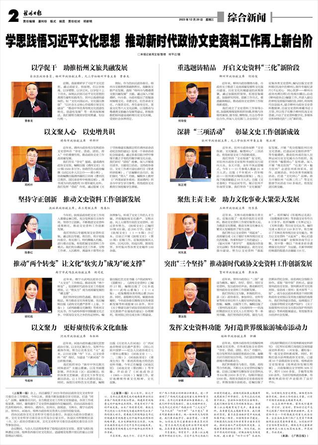 本报讯(记者周文俊)12月19日,学习贯彻习近平文化思想暨全区政协文史资料选题协作工作推进会在我市召开。会议深入学习贯彻习近平文化思想,交流全区政协文史资料工作好经验好做法,推进新时代全区政协文史资料工作创新发展。自治区政协副主席刘咏梅出席会议并讲话;自治区政协副秘书长宁玉琼,自治区政协文化文史和学习委员会主任吕洁、副主任白志繁、专职副主任谢育盛参加会议;受自治区人大常委会副主任、桂林市委书记周家斌,市长李楚委托,市政协主席陈丽华参加会议并致辞,副主席钟麟在会上作交流发言,副主席文建中参加考察。