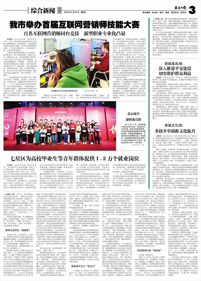 党的十八大以来,全市宣传思想文化战线坚持以习近平新时代中国特色社会主义思想为指导,认真贯彻落实习近平文化思想和习近平总书记对广西重大方略要求,紧紧围绕举旗帜、聚民心、育新人、兴文化、展形象这一使命任务,聚焦打造桂林世界级旅游城市的中心大局,守正创新,担当作为,推动宣传思想文化工作交出高质量答卷。