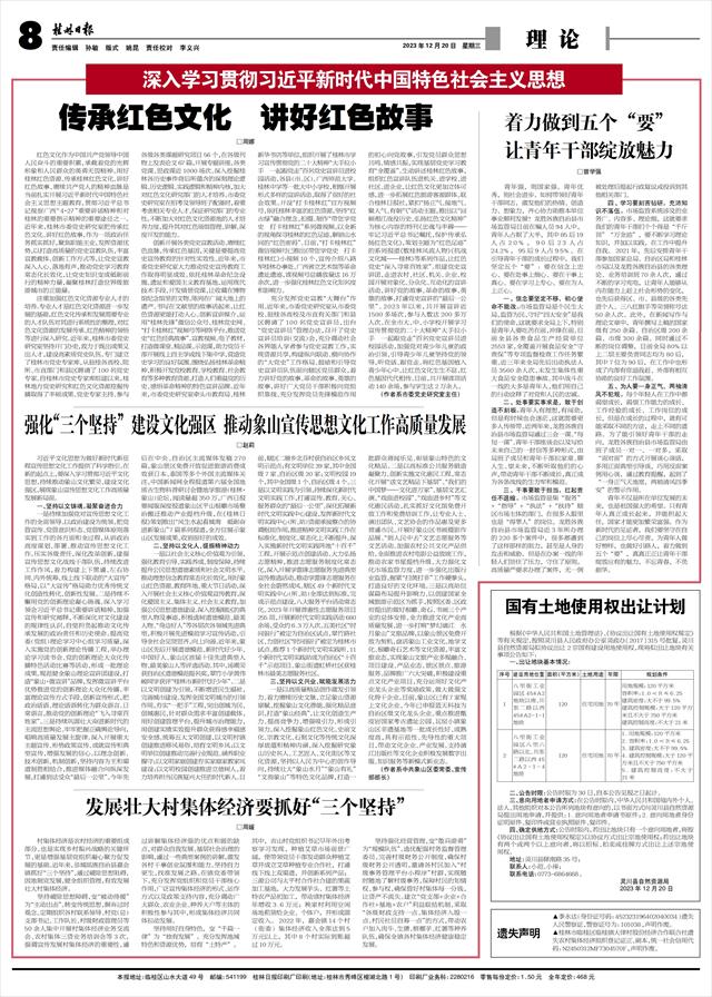 一是持续加强党对宣传思想文化工作的全面领导。以政治建设为统领,把党管宣传、党管意识形态、党管媒体原则落实到工作的各方面和全过程,从讲政治高度谋划、部署、推动宣传思想文化工作。压实各级责任,深化改革创新,建强宣传思想文化战线干部队伍,持续改进工作作风,着力构建上下贯通、左右协同、内外统筹、线上线下联动的“大宣传”格局,以“大宣传”格局助力优秀传统文化创造性转化、创新性发展。二是持续不懈用党的创新理论凝心铸魂。深入学习领会习近平总书记重要讲话精神,加强宣传和研究阐释,不断深化对文化建设的规律性认识,自觉担负起推动文化传承发展的政治责任和历史使命。提高党委(党组)理论学习中心组学习质量,深入实施党的创新理论传播工程,举办理论学习读书会、党的创新理论大众化传播特色活动比赛等活动,形成一批理论成果。规范健全象山理论宣讲团建设,打造“象山·微宣讲”品牌,发挥微宣讲平台优势推进党的创新理论大众化传播。丰富理论宣传方式手段,创新宣传形式,把政治话语、理论话语转化为群众语言、日常语言,推动党的创新理论“飞入寻常百姓家”。三是持续巩固壮大奋进新时代的主流思想舆论。牢牢把握正确舆论导向,唱响高质量发展主旋律。深入开展重大主题宣传、形势政策宣传、成就宣传和典型宣传,增强发展的信心。以理念创新、技术创新、机制创新,坚持内容为王和渠道制胜相结合,推进媒体融合向纵深发展,打通到达受众“最后一公里”。今年先后在中央、自治区主流媒体发稿270篇,象山景区免费开放促进旅游消费成效获日本、泰国等多个外国主流媒体关注,中国新闻网全程报道第六届全国地质古生物科普研讨会暨地学旅游(桂林·象山)论坛,阅读量超350万,广西日报要闻版深度报道象山区平山根雕市场整治搬迁推动产业提档升级,在《桂林日报》策划推出“风生水起看城南 砥砺奋进新象山”7篇系列报道,全方位展示象山区发展成果,收到很好的成效。