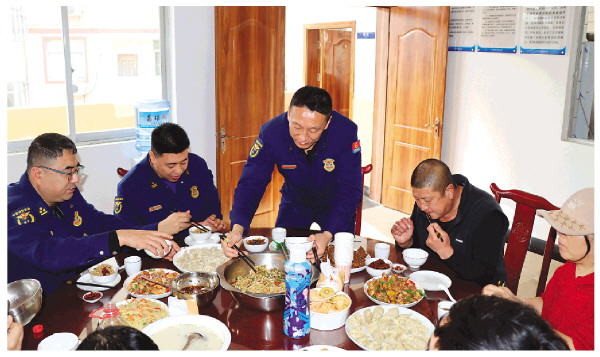 “叔叔的手艺真好,炒面真好吃。”“阿姨手包的饺子也很赞。”战友们对吴保德父母的好手艺赞不绝口。大家一起吃着热腾腾的午饭,聊天话家常。