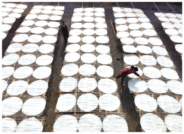 “靠天吃饭”是制作莲花粉手艺人的真实写照,好的天气制作出来的莲花粉能保存近半年。1月16日,冬日的太阳晒得人暖意洋洋,记者来到刘年春家看到,他正在打浆、摇浆,接着将摇匀的米浆放入锅中蒸制、取出脱模,就得到了制作莲花粉米皮,接着他将米皮搬到院子里进行自然晾晒。置身于晾满米皮的院子里,浓浓的米香迎着风扑面而来。