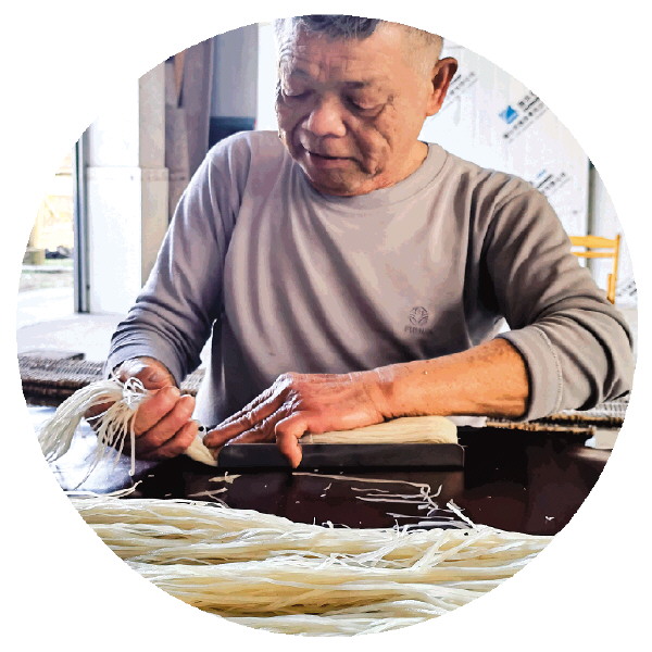 制作莲花粉的过程不算复杂,打米浆、摇米浆、蒸米浆、晒米浆,再将晒好的米浆过油等一系列处理后,用机器切成条状,再用模具将莲花粉扎成一扎,放到竹架上自然风干即可。今年已经71岁的刘年春,从1981年开始制作莲花粉,40多年的老手艺,让他对莲花粉的制作有着独到的见解。“摇的时候必须掌握好米浆的均匀程度,蒸的时候要有耐心,时间和火候的控制也很重要,5分钟能出3张皮就可以了。”刘年春滔滔不绝地介绍着制作要点,和莲花粉几乎打了一辈子交道的他,不仅靠着这门手艺将莲花粉做出了口碑,也靠着做莲花粉盖起了新房子。