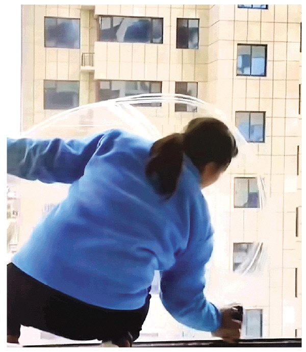 一名家政保洁人员在客户家里擦窗户。 (受访者供图)