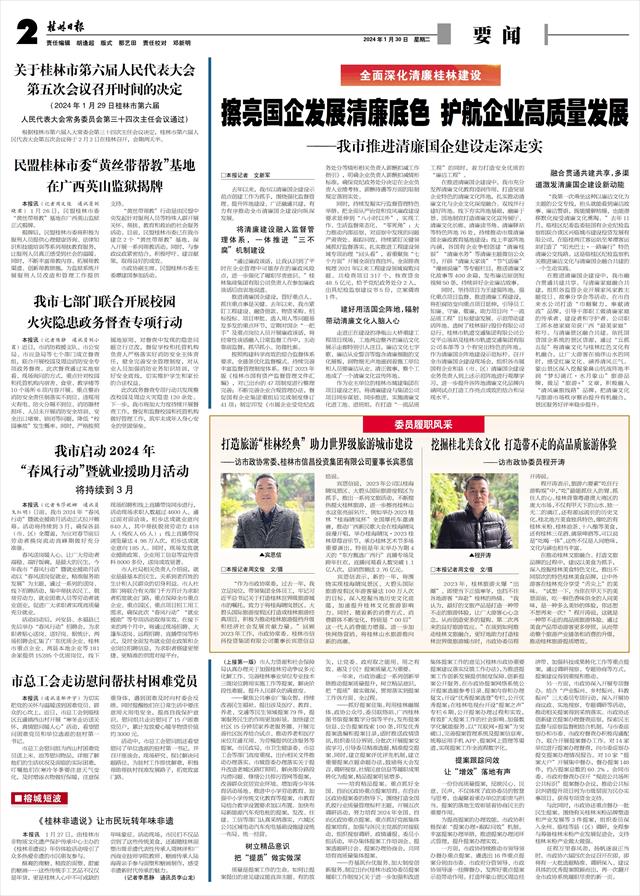 ——聚焦法治建设献计出力,促进社会和谐稳定。委员们着眼推动依法行政、推进基层协商民主、加强专项治理等方面提出提案27件,推动了基层治理能力不断提升。关于制定桂林市侵害未成年人案件强制报告制度实施细则的提案,市检察院、市教育局等九部门高度重视,经充分调研协商后及时出台了具体实施细则。关于整顿桂林旅游市场、加大“养老诈骗”整治工作、治理预付费陷阱等提案,相关职能部门集中开展了专项整治。(下转第二版)