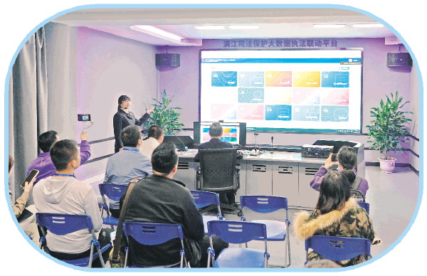 ▲中央媒体记者团参观漓江司法保护大数据执法联动平台。