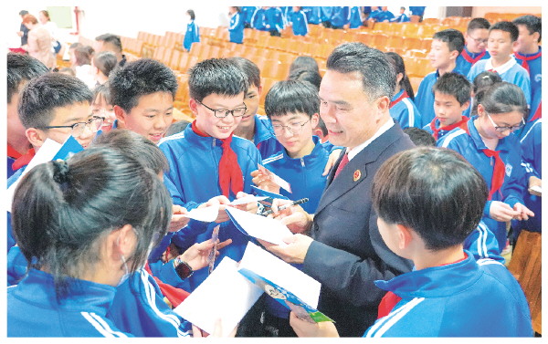 ◤赖家明检察官到市逸仙中学作法治宣讲。活动结束后,学生们纷纷请他签名。