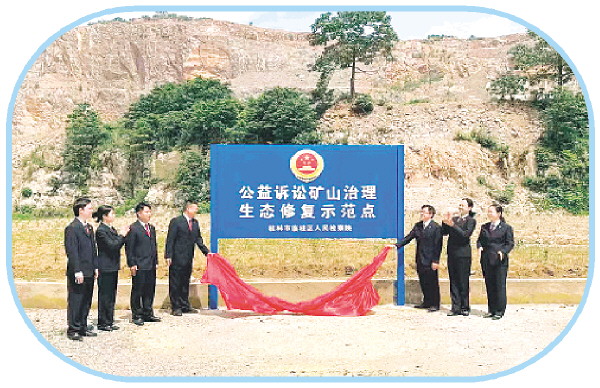 ◥2023年5月15日,临桂区检察院在生态修复工程已完成三分之一的临桂镇侯寨村石灰岩矿举行“公益诉讼矿山治理生态修复示范点”揭牌仪式。