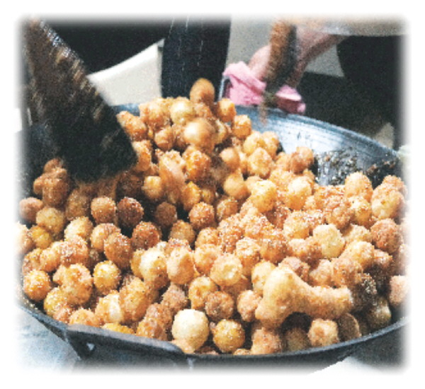 在厨房里,李小凤将麻通面剂倒入油锅油,油锅里顿时嗞嗞作响。她再用漏勺轻轻推动面剂,避免面剂粘连。大约10分钟,焦黄喷香的麻通就炸好了。“现在炸出的麻通也能吃,不过我们这里喜欢吃甜口,还需要给麻通上糖。”李小凤将炸好的麻通捞出,放入熬有糖浆的热锅里,只见她双手持木铲,快速翻搅麻通,将黄糖熬成的糖浆覆盖到麻通表面,而另一位嫂子则往锅里撒炒熟的芝麻。这样不停翻搅,让每颗麻通均匀粘上糖浆和芝麻,一锅麻通就做好了。