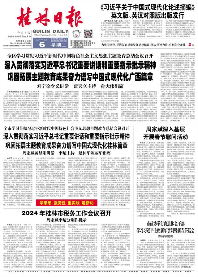 徐令义指出,主题教育开展以来,广西壮族自治区党委始终把开展主题教育作为坚定拥护“两个确立”、坚决做到“两个维护”的重大政治检验,加强领导、精心组织、突出重点、狠抓落实,扎实推进理论学习、调查研究、推动发展、检视整改,把深入学习宣传贯彻习近平总书记视察广西重要讲话精神作为善始善终抓好主题教育的重点内容,切实把习近平总书记的关怀厚爱转化为建设新时代壮美广西的有力行动。在两批主题教育中,广西坚持“严、实、效”标准,注重将开展主题教育这一政治任务与推动高质量发展这一中心任务紧密结合,各方面工作取得新进展,相关做法得到中央主题教育办和广大党员、干部、群众肯定。要深入贯彻落实习近平总书记关于主题教育的重要讲话和重要指示批示精神,坚持以学铸魂,坚持不懈抓好理论武装,建立健全“第一议题”制度,健全理论学习制度,强化党性教育,持续推动习近平新时代中国特色社会主义思想入心见行,把党中央重大决策部署不折不扣落实好。要坚持以学增智,加强党员、干部政治教育和政治训练,提升党员、干部思维能力,坚持干什么就重点学什么、缺什么就重点补什么,(下转第三版)