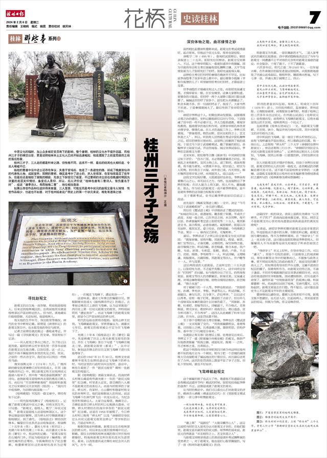 ……明代张鸣凤撰写了《桂故校注》,记载了赵观文重试中状元之事,但有关其生卒,只写道:“赵观文,临桂人,乾宁二年状元及第。”赵观文是临桂人还是桂林郊区人,这个争议倒是很好解释,因为桥头村早期就曾属于临桂辖区。到了清代,《临桂县志》曾经四次修本,编纂官员也多次走访收集县史。有康熙二十五年本(佚)、嘉庆七年本(称旧志)、光绪六年本和光绪三十年本。而在嘉庆七年本的《署宅》中,有这样的记载:“赵观文故宅在石城西门外,旧址为临桂县学(编者按:即唐代城西的迁莺坊。令狐綯曾经为了纪念曹邺,将曹邺曾居住过的阜财坊改名为迁莺坊)。一在城北飞鸾峰下,遗址犹存……”