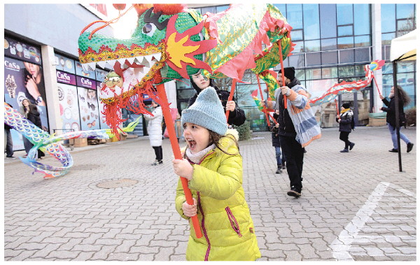 2月3日,在匈牙利布达佩斯唐人街新春庙会上,一名女孩体验舞龙。新华社发(弗尔季·奥蒂洛 摄)