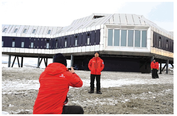 2月6日,在中国南极秦岭站开站前,建设者们来到主楼前拍照留念。新华社记者周圆 摄
