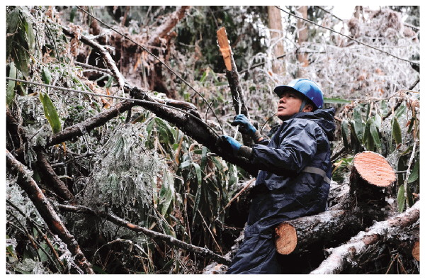 供电抢修人员正在修复被树木压断的导线。 陆国辉 摄