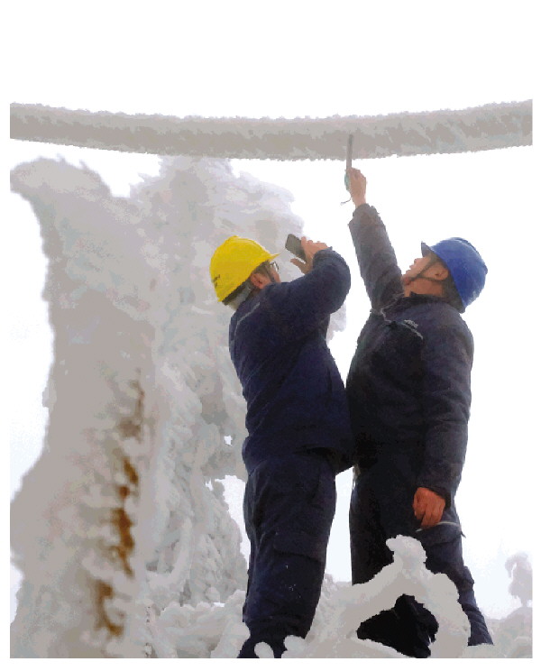 巡视人员正在资源隘门界观测线路覆冰情况。 陆国辉 摄