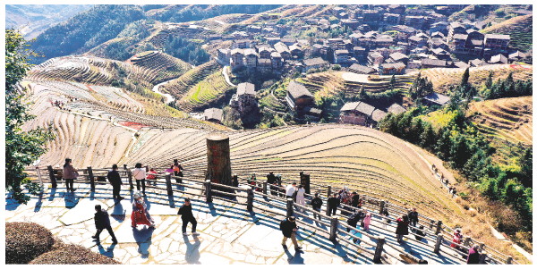 为了迎接春节长假客流高峰的到来,龙脊梯田景区提前制定旅游接待应急预案,景区工作人员坚守岗位、按部就班,设立党员先锋岗,积极做好旅游购票服务、疏导景区道路交通等工作,确保游客游得舒心、满意而归。据龙脊梯田景区工作人员介绍,当天共有6000多名游客进入景区观光游览。图为游客在龙脊梯田观光游览。