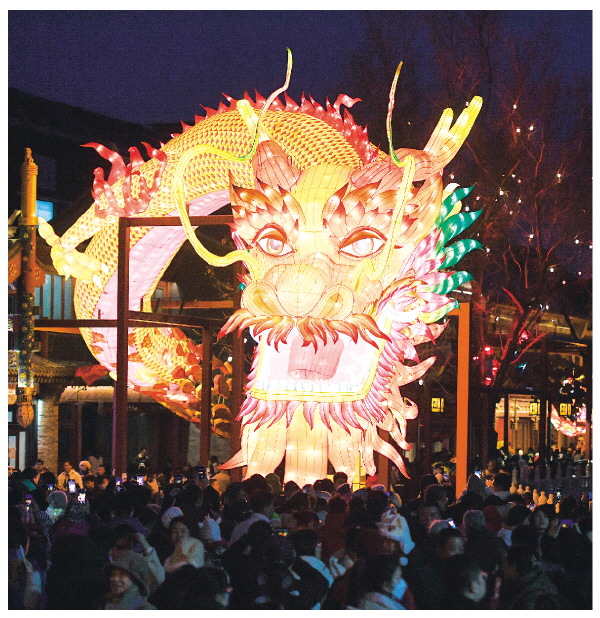 ▲2月14日,在北京市西城区什刹海荷花市场,游客观赏巨型龙灯“蛟龙出海”。 新华社记者鞠焕宗 摄