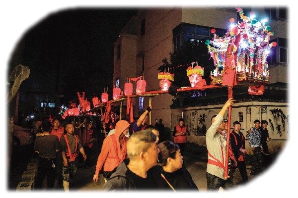 2月19日,在澧浦镇里新村,村民们抬着长长的传统板凳龙在村落中穿行。