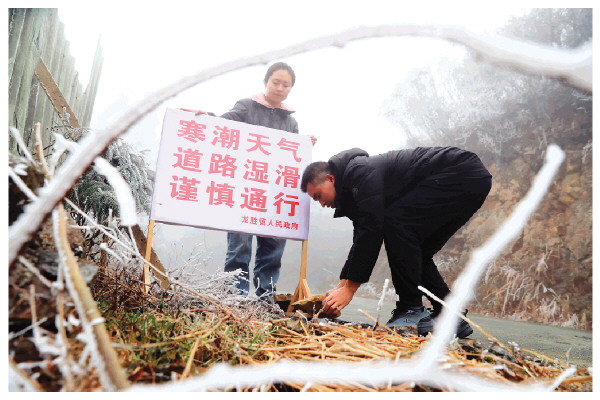 随后,记者驱车半个多小时,到达海拔1200米的上孟村大坪塘组,山上云雾缭绕,树木竹子上挂满了雾凇。龙胜镇政府工作人员把警示牌摆放到路旁,提醒过往的行人和车辆注意安全。