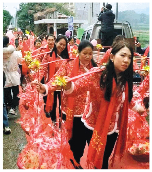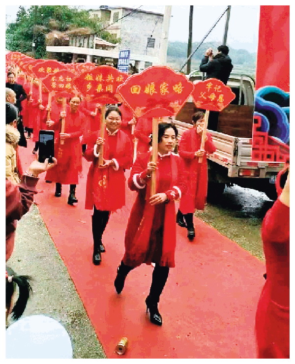 正月初六,全州县岩泉村举行“姑娘回娘家”活动。出嫁女身穿红色服装,挑着水果,举着感恩话语牌,有说有笑,开开心心回娘家。唐文姣 摄