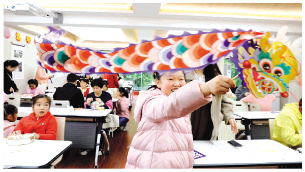 在解东社区,小朋友迫不及待地舞动刚制作好的龙灯。 记者陈静 摄
