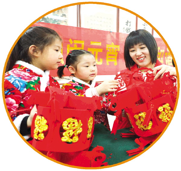 2月22日,在河北省唐山市丰润区太平路街道纺织一社区,党员志愿者教小朋友制作花灯。