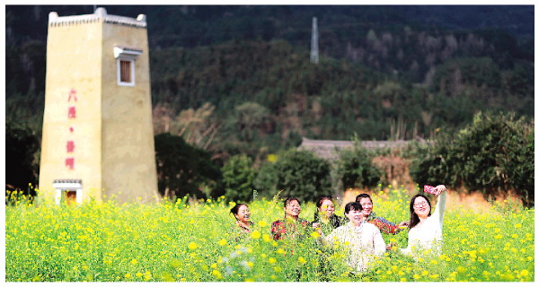 ▲六漫村油菜花盛开,市民游客们在欣赏美景,拍照留念。
