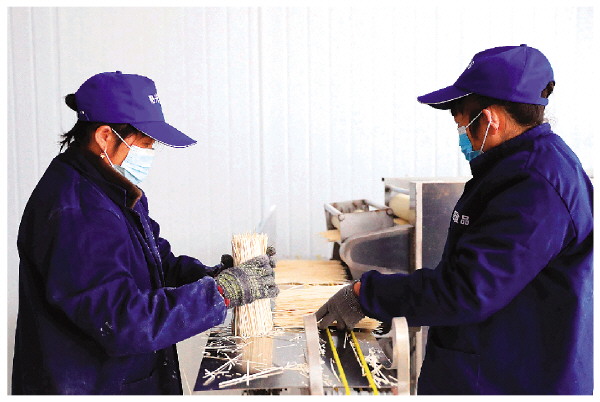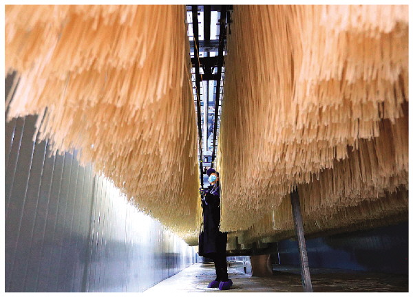 ▲东阳村面条厂内,身着工作服的村民正在整理面条。