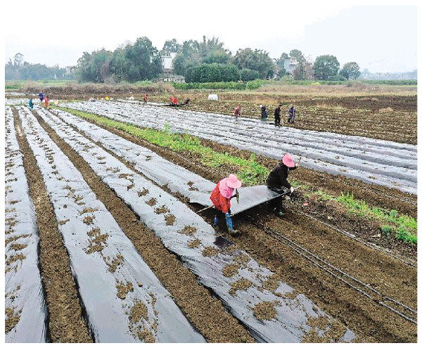 ▲挥锄覆膜忙春播,荔浦五万亩荔浦芋陆续被种植。