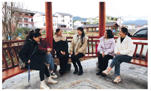 ▲尹杜娟(右三)在村里和一些年轻的“媳妇”聊天,讨论将良好的文明氛围传承下去。